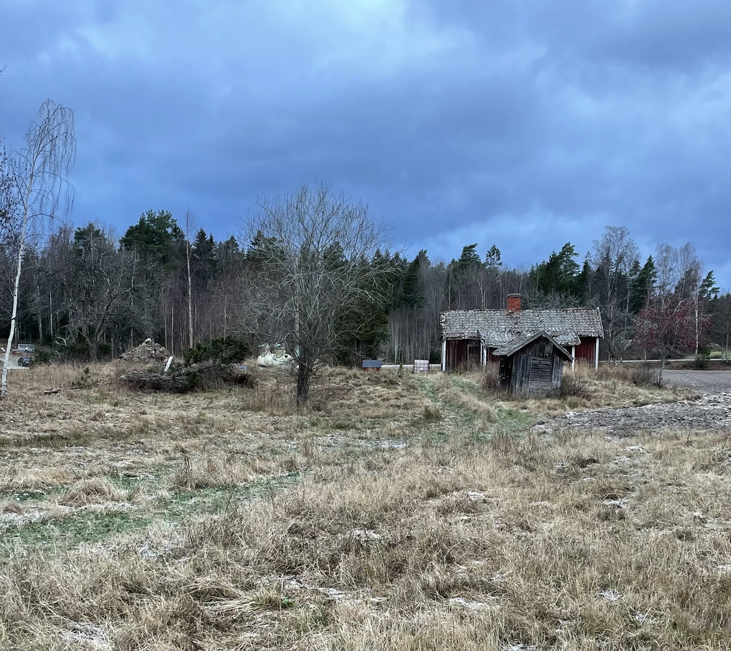 Ödetorpet Ringshagen finns fortfarande kvar. Till vänster om äppelträdet i mitten på bilden finns en torpruin som vi tror kan vara Backstugan u. Ringshagen.