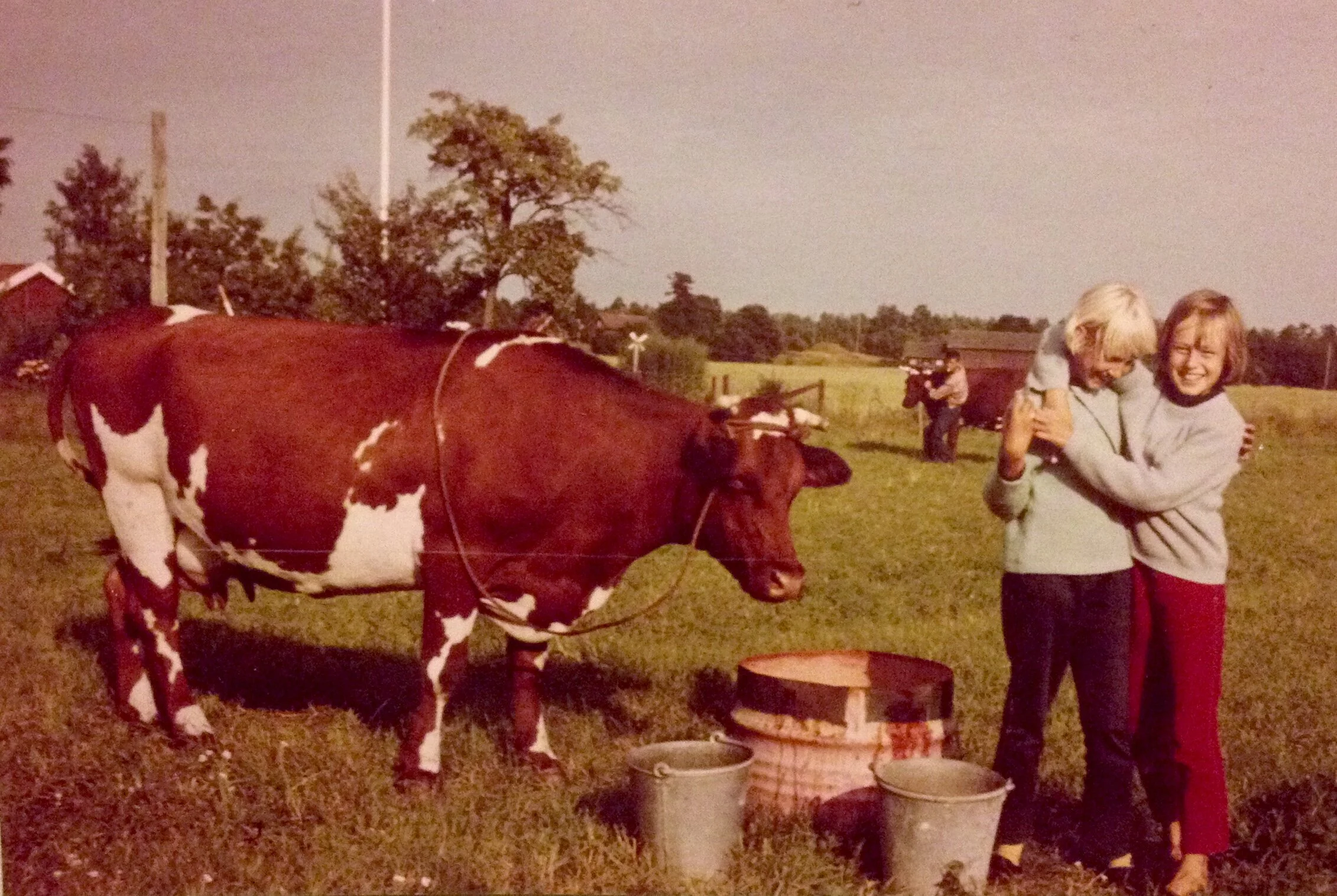 På 50- & 60-talet fick de sex korna från Rudolf Bloms gård (granne med soldattorpet Kroken) vandra ner till bete på åkermarken längst ner i byn där gården hade en markbit. Kossan på bilden hette Mossi, och Birgitta Ekblad och Pia Sonesson var de hängivna kopigorna!