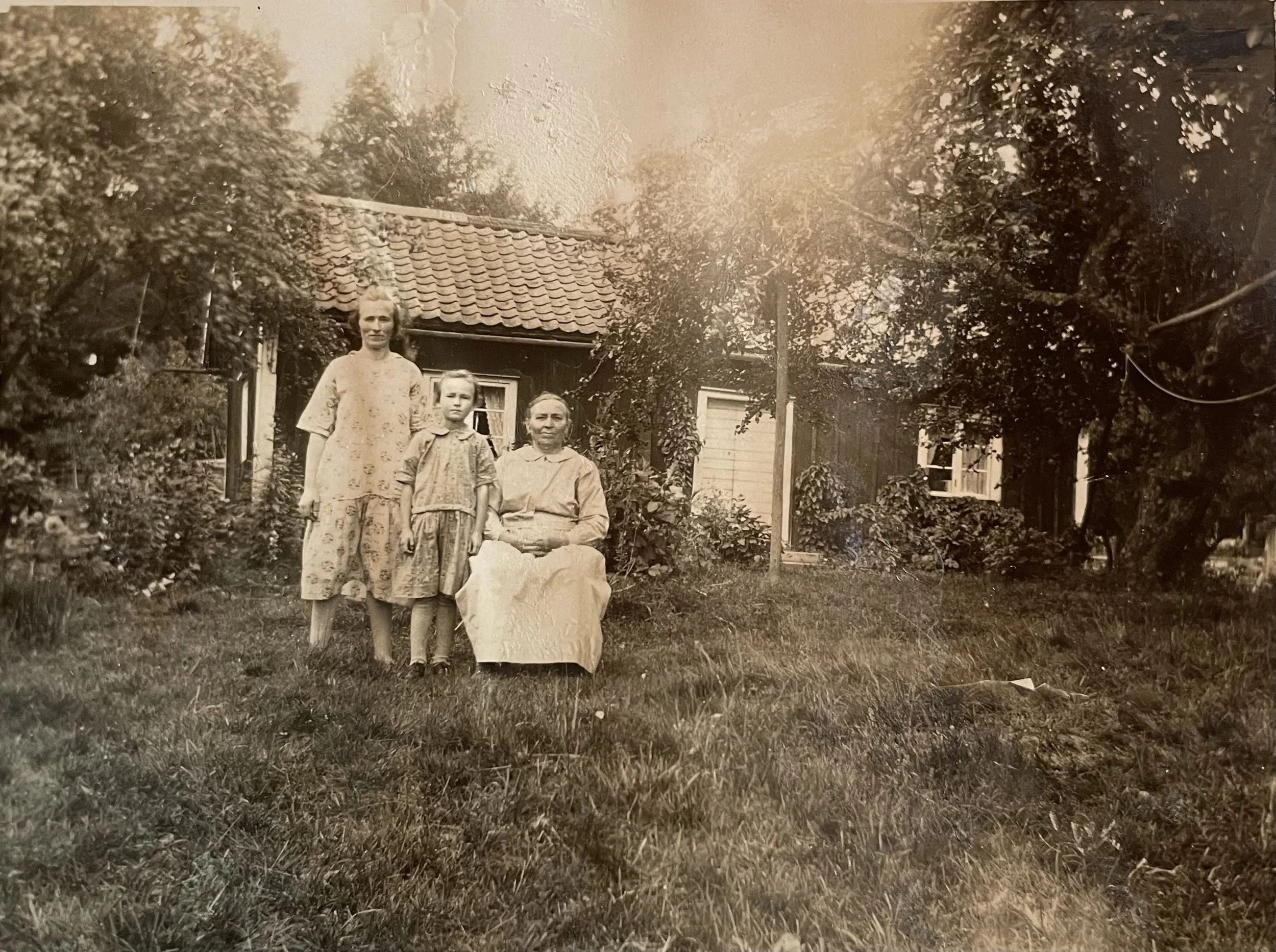 På bilden syns Tekla, * 1891 + 1979, som flicka längst till vänster förmodligen tillsammans med sin lillasyster Selin, på besök hos mormor Johanna Mathilda Isgren i Lilla Grönlid. Tekla utvandrade till Amerika 1910