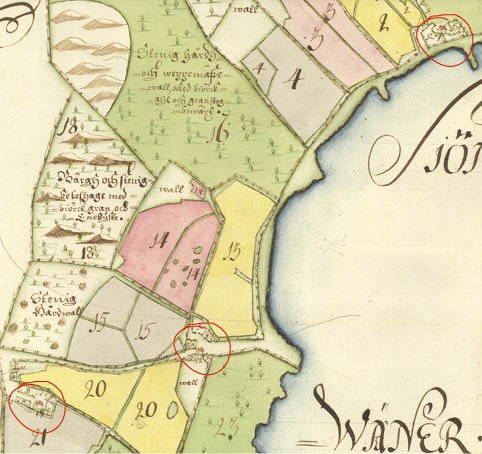 På kartan från 1713 finns de tre gårdarna med (inringade med Nolgården längst upp, Mellomgården nedanför och Sörgården längst till vänster) men det är fortfarande bara en Sörgård och den ser ut att ligga uppe vid Klippingsbergsvägen.